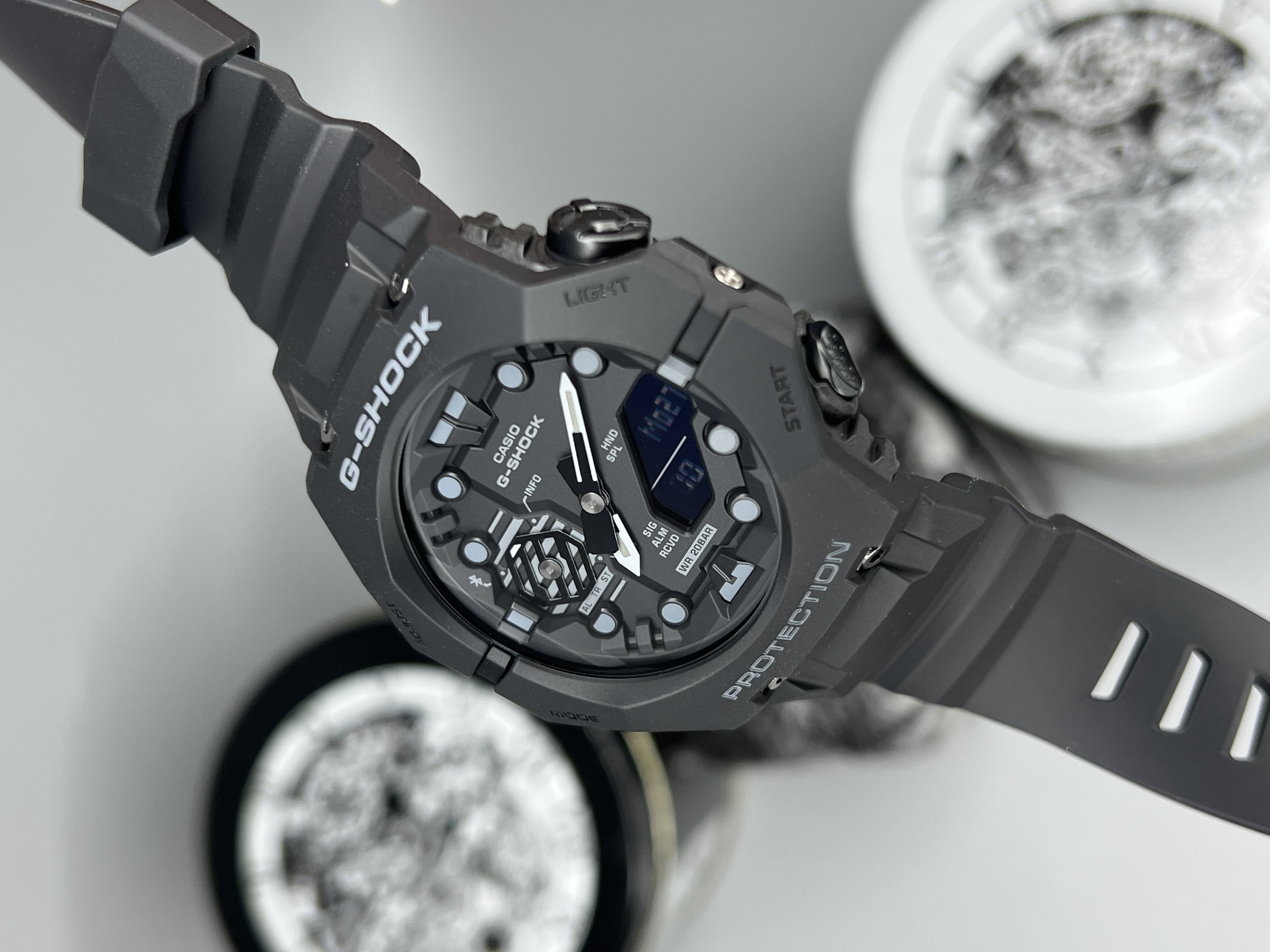 ساعت Casio G-Shock GA-B001 یکی از مدلهای مدرن و مقاوم جیشاکه که با طراحی سبک و بدنهی Carbon Core Guard ساخته شده. این مدل علاوه بر مقاومت بالا در برابر ضربه و آب تا عمق ۲۰۰ متر، از قابلیت Bluetooth برای اتصال به موبایل هم برخورداره. ترکیب نمایش آنالوگ و دیجیتال، نور پسزمینه قوی و طراحی آیندهنگر، اون رو به انتخابی عالی برای استایلهای اسپرت و روزمره تبدیل کرده.