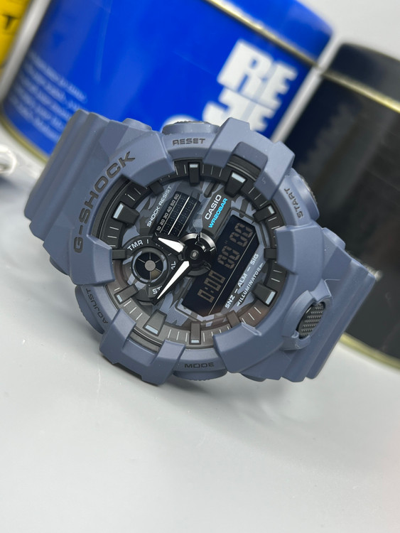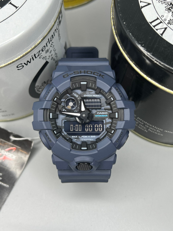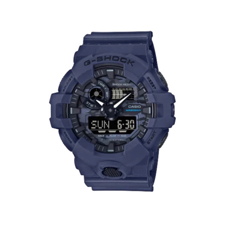 ساعت G-Shock GA-700CA با طراحی نظامی و طرح استتاری (Camouflage) ساخته شده و ظاهری خشن و اسپرت دارد. این مدل ضدضربه و ضدآب تا عمق ۲۰۰ متر است و امکاناتی مانند کرنومتر، تایمر، آلارم، نور LED و عمر باتری ۵ ساله دارد. ترکیب نمایش آنالوگ و دیجیتال آن، هم ظاهر مدرنتری ایجاد کرده و هم استفادهاش را کاربردیتر کرده است.