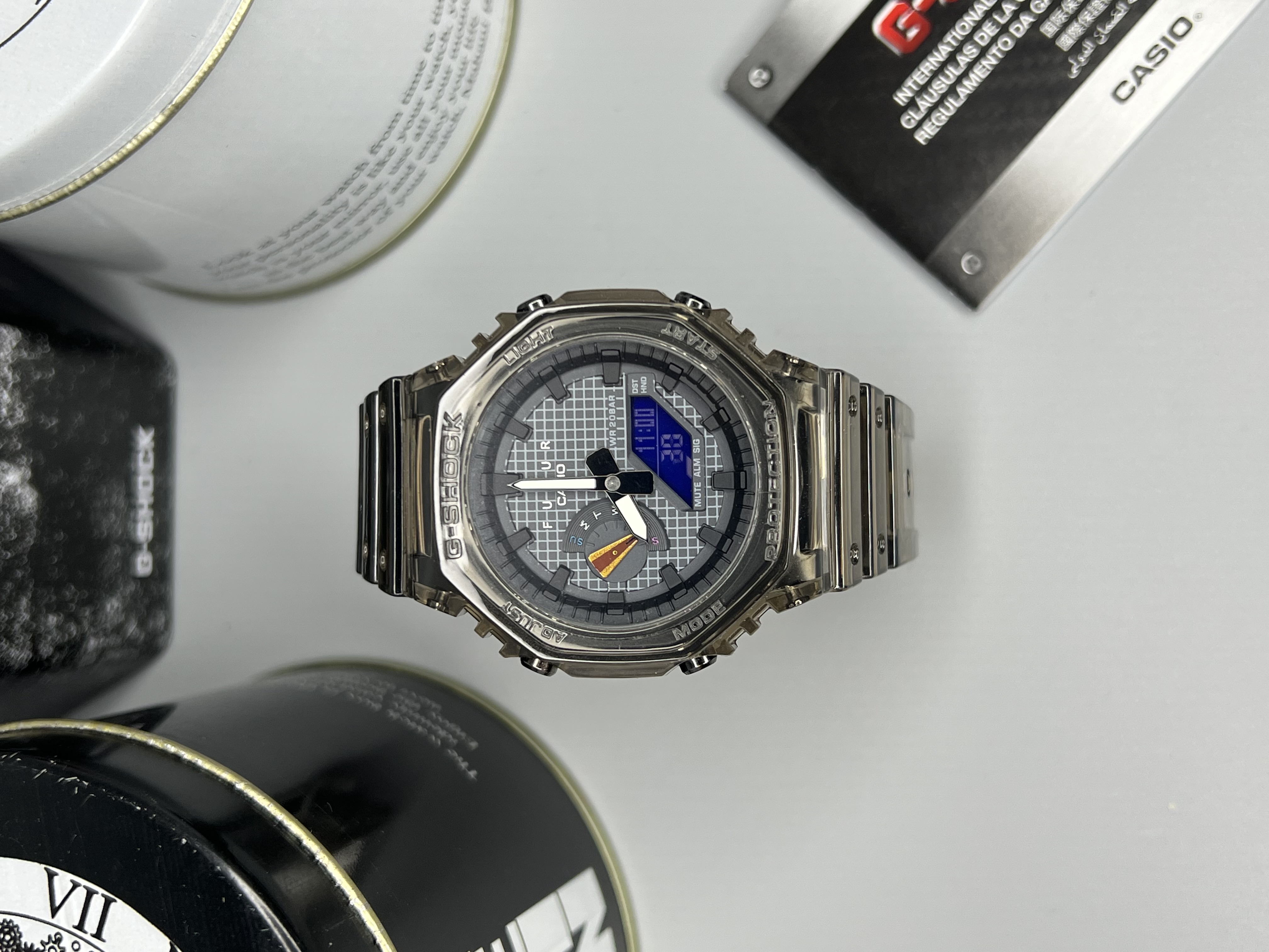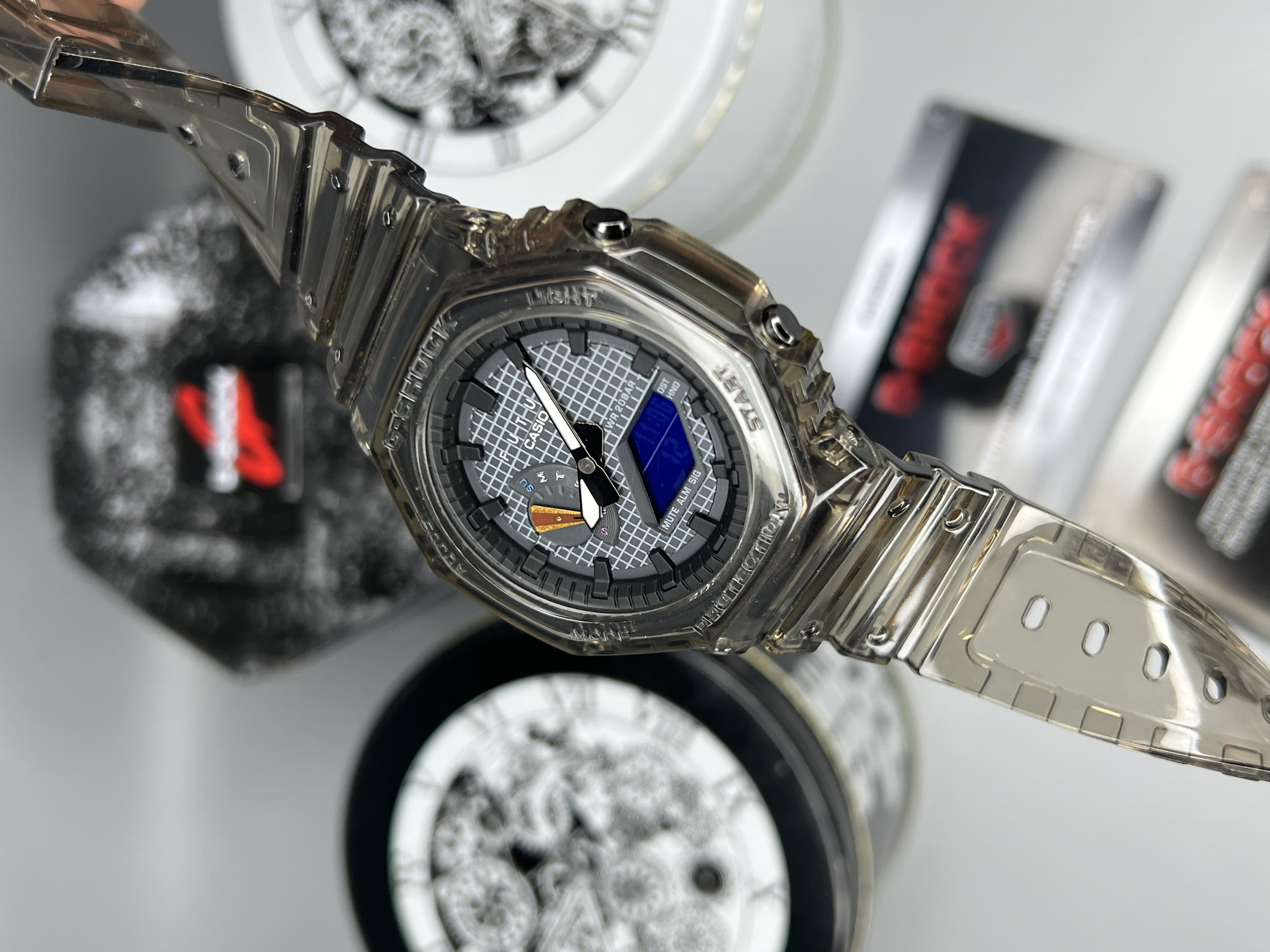 ساعت G-Shock GA-2100FT حاصل همکاری خاص با برند فرانسوی FUTUR است و با طراحی شفاف خاکستری و جزئیات آبی، سفید و قرمز، ظاهری مدرن و خاص دارد. بدنهی سبک و مقاوم آن با ساختار Carbon Core Guard ساخته شده تا در برابر ضربه و فشار دوام بالایی داشته باشد. این مدل با امکاناتی مانند کرنومتر، تایمر، زمان جهانی، نور LED و مقاومت در برابر آب تا عمق ۲۰۰ متر عرضه شده است. انتخابی عالی برای کسانی که به دنبال ترکیب استایل شهری و عملکرد حرفهای هستند.