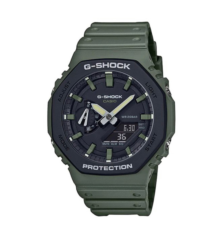 مدل G-SHOCK GA-2110SU-3A با طراحی خاص سبز ارتشی و قاب هشتضلعی، ظاهری مدرن و ماجراجویانه دارد. بدنه سبک که در برابر ضربه مقاوم است. این ساعت برای استایل اسپرت یا استفاده روزمره انتخابی عالی است. ترکیب رنگ و طراحی آن حس قدرت و سادگی را همزمان منتقل میکند.
