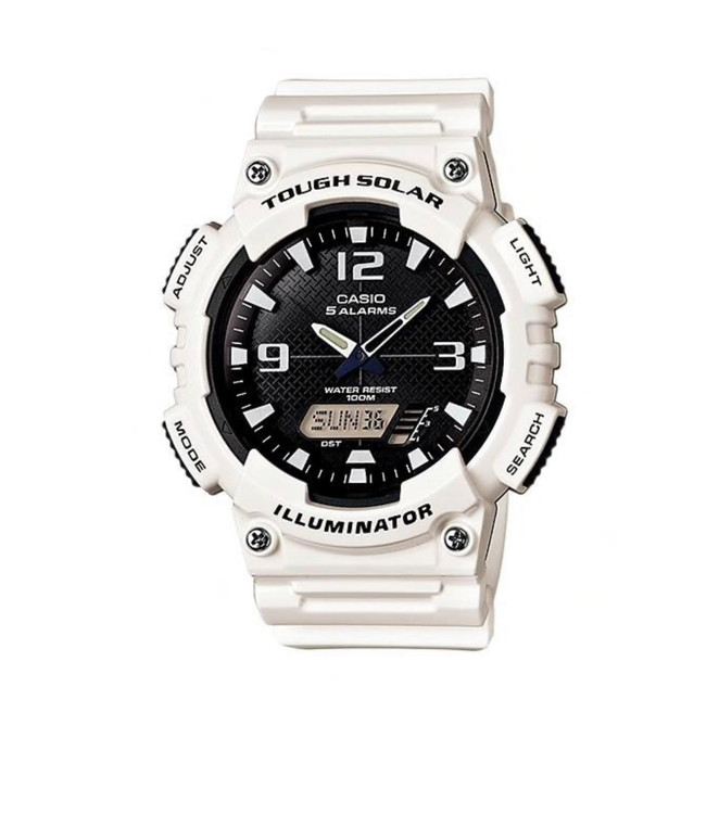 ساعت مچی مردانه کاسیو مدل AQ-S810WC-7AV ترکیبی از نمایشگر آنالوگ و دیجیتال و طراحی اسپرت است. بدنه و بند رزینی سفید دارد و مقاوم در برابر آب تا ۱۰۰ متر است. این ساعت با انرژی خورشیدی (Tough Solar) کار میکند و دارای کرونومتر، تایمر، آلارم و تقویم خودکار است. نور پسزمینه LED و قابلیت نمایش زمان جهانی آن را برای استفاده روزمره و ورزشی مناسب میکند