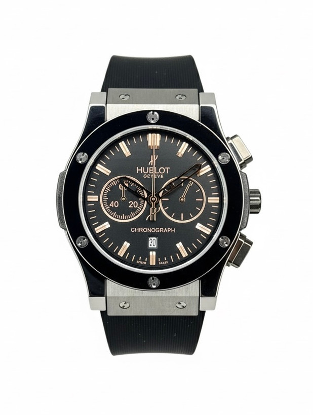 ساعت Hublot Big Bang Chronograph مشکی ترکیبی از طراحی لوکس و عملکرد حرفهای است. قاب ۴۴ میلیمتری ،صفحه مشکی با عقربهها و جزئیات رزگلد، جلوهای مدرن و خوانا دارد. این مدل مجهز به کرنوگراف، نمایش تاریخ، بند رابر با قفل تاشو راحتی و استحکام را در کنار زیبایی ارائه میکند.